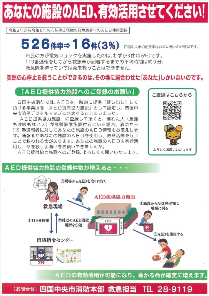 この度、マルカワは四国中央消防署の依頼を受け、AED提供協力施設として登録することになりました!(`・ω・´)ゞ